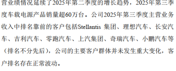 市场拓展方面,公司持续获得国内外主流客户定点,除小鹏、理想、岚图等国内品牌外,还新增吉利、零跑、上汽等重要客户的800V新项目定点,同时还打入了Stellantis、雷诺等国际品牌的供应链体系。这也是公司当前主要的客户群。