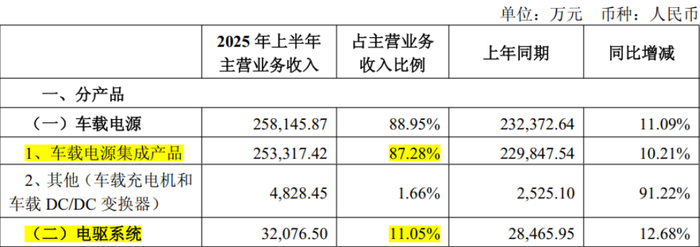电驱系统包括电机控制器、驱动电机、减速器和电驱总成(电机+控制器+减速器集成)。2025年上半年,车载电源贡献了威迈斯89%主营业务收入,电驱系统则贡献了另外的11%。