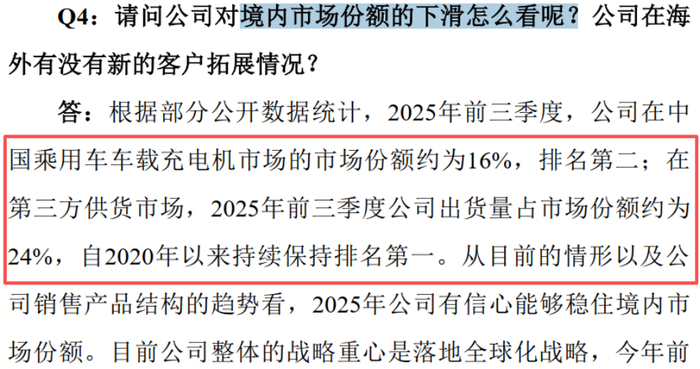 从市场地位看,2025年前三季度,威迈斯在国内乘用车车载充电机市场的市场份额约16%,排名第二,仅次于比亚迪旗下弗迪动力。在第三方供货市场,威迈斯自2020年以来持续保持排名第一。