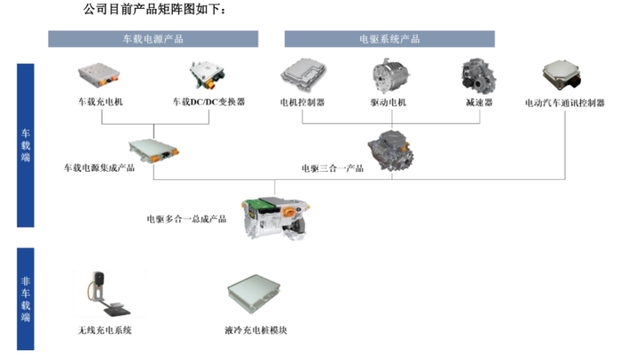 分具体产品看,威迈斯目前业务主要包括车载电源系统与电驱系统两大板块。其中,车载电源系统包括车载充电机(OBC)、车载DC/DC变换器以及高度集成的“车载电源集成产品”,公司对外销售的绝大多数都是集成产品。