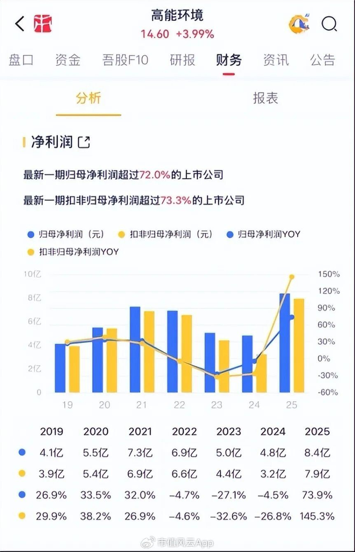 2025年高能环境扣非净利润为7.9亿,同比增长1.4倍。业绩向好下,股价亦得到支撑,年内已暴涨近90%。