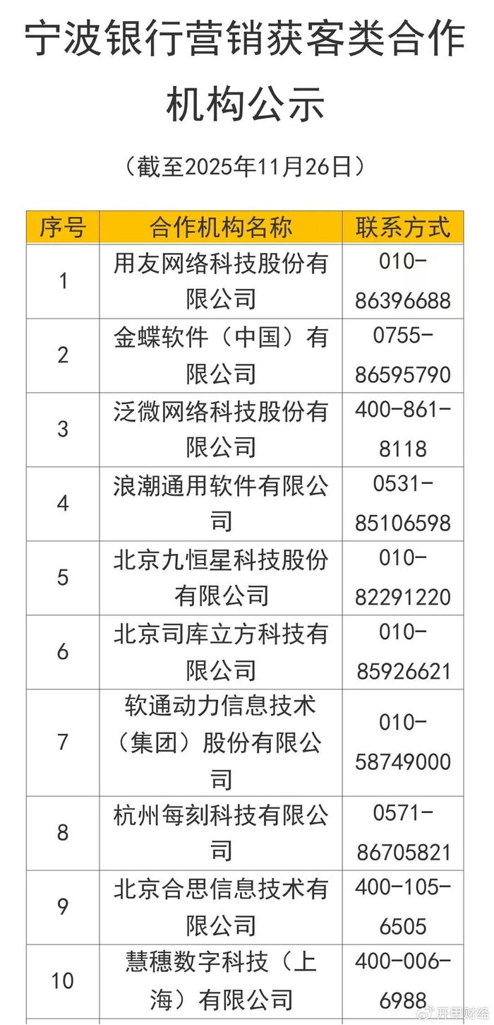 另外,宁波银行披露的营销获客类合作机构名单显示,截至2025年11月26日,该行营销获客类合作机构共369家。