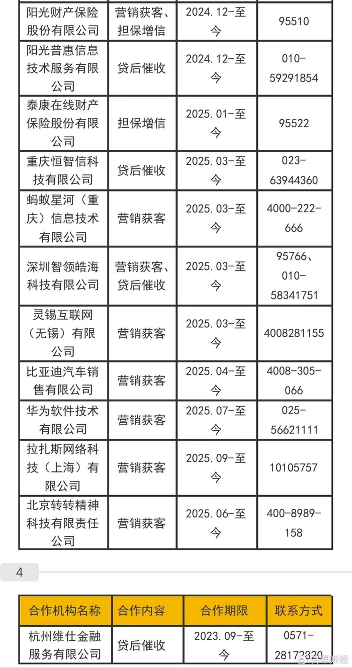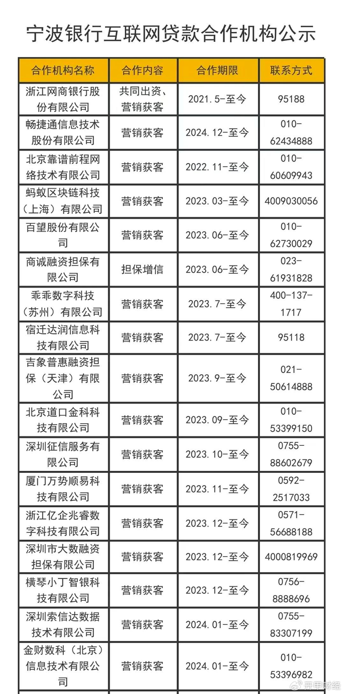 宁波银行披露的互联网贷款合作机构名单显示,该行共与122家机构合作互联网贷款业务,具体包括:网商银行、畅捷通、办公逸、乖乖数科、道口金科、粤财征信、顺丰科技、中移金科、吉象普惠(中国太平旗下)、找钢网、财付通小贷、唯品会、众安在线、钉钉、爱奇艺、中国银联、比亚迪汽车、华为、淘宝闪购、转转等。