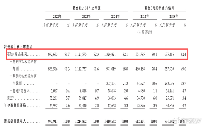 招股书数据显示,截至2024年,蔓迪旗下的“米诺地尔酊剂”与“米诺地尔泡沫”合计占当年中国米诺地尔零售额的70%,远远超过第二至第五名之和。