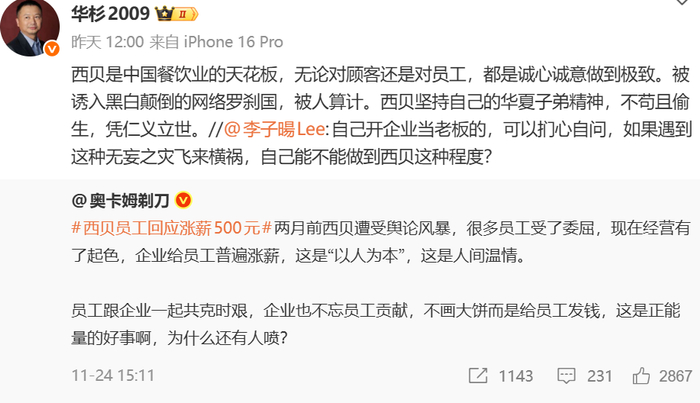 11月25日,华与华创始人华杉一条微博直接点燃战火:“西贝是中国餐饮业的天花板,诚心诚意对顾客对员工,却被诱入黑白颠倒的‘网络罗刹国’遭人算计!华夏子弟精神,不苟且偷生,凭仁义立世!”