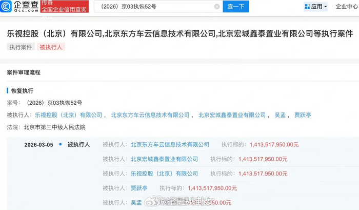 贾跃亭及乐视控股恢复执行14.1亿,累计被执行金额达22.67亿元