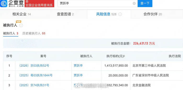 贾跃亭及乐视控股被恢复执行14.1亿,目前,贾跃亭关联3项被执行人信息,被执行总金额约22.67亿元[思考]