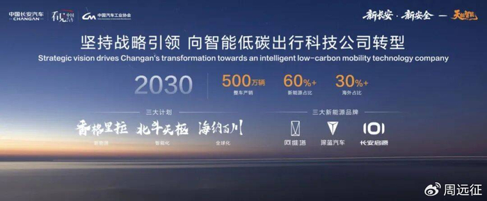 面向未来,中国长安汽车的目标是到2030年,中国长安汽车整车产销将冲刺500万辆,其中新能源占比超60%,海外占比超30%,始终锚定世界一流汽车品牌。