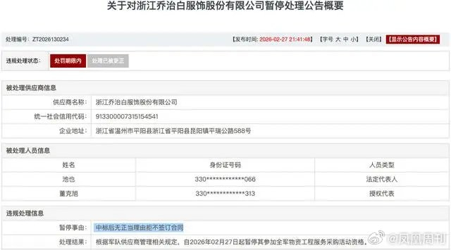【#乔治白被暂停全军采购资格#:中标后拒签合同,业绩已大幅下滑】#凤凰周刊财经频道#“职业装第一股”乔治白(002687.SZ)近日因采购违规被暂停全军采购活动资格。军队采购网2月27日发布公告,浙江乔治白服饰股份有限公司在参加项目编号为2024-JQ05-W1972(36)和2024-JQ05-W1972(4)的采购活动中,涉嫌存在违规失信行为,暂停事由为“中标后无正当理由拒不签订合同”。