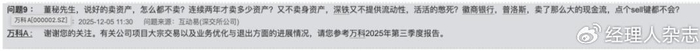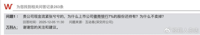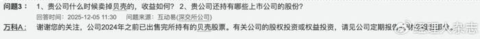 万科董秘称2024年公司已经出售贝壳股票资产;对于出售徽商银行7%股权,万科董秘没有正面回应。