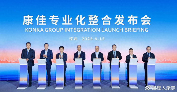 人事整合同步推进,2025年8月14日,康佳召开第四次临时股东大会,选举产生由9人组成的第十一届董事会。其中6名非独立董事中,除康佳老将、总裁曹士平及员工代表叶兴斌外,其余4席均由华润系人员占据——曾掌舵华润医药商业集团的邬建军当选新一届董事长,出身华润财务体系的余惠良兼任董事、财务总监,宋清、孙永强两位董事则仍在华润集团任职。8月15日,康佳在深圳举行专业化整合发布会,正式官宣成为华润集团旗下科技与新兴产业板块业务单元,华润集团董事长王祥明表示,整合工作整体推进顺利,后续康佳需进一步明晰战略方向、优化资源配置,提升核心竞争力。