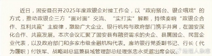近日,廊坊银行官方发布消息,固安县召开2025年度政银企对接工作会,廊坊银行党委副书记、行长(代为履职)付铁军、战略副总监兼县域管理部总经理张忠永受邀出席会议。