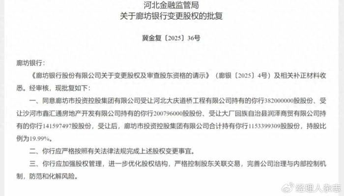 金监总局相关批复显示,廊坊银行股权变更申请已获得河北金融监管局的正式批复。廊坊市投资控股集团有限公司将分别受让河北大庆道桥工程有限公司持有的3.82亿股、沙河市鑫汇通房地产开发有限公司持有的2.01亿股以及大厂回族自治县润泽商贸有限公司持有的1.42亿股。受让完成后,廊坊控股合计持股比例为19.99%,廊坊银行成为第一大股东。