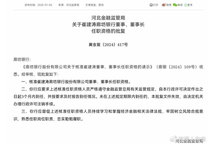与付铁军一样,崔建涛也来自国有大行,原为中国银行廊坊分行行长。