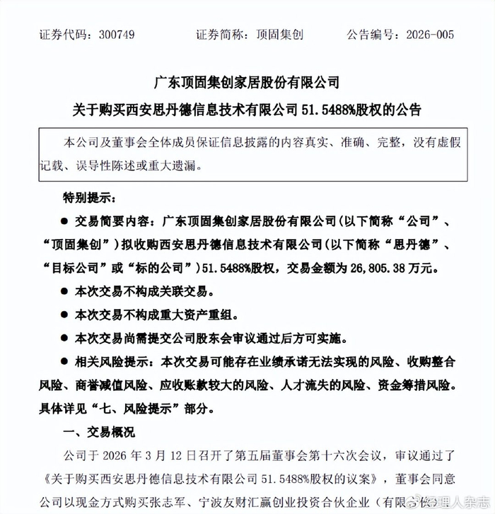 此次收购也是2026年A股跨界并购潮的一个缩影。今年以来,多家传统行业上市公司纷纷通过跨界布局新兴产业,寻找新的增长极,顶固集创从定制家居跨界电子信息,正是这一趋势的体现。但高溢价、跨赛道的收购背后,隐藏着多重风险:业绩承诺兑现难度大、跨行业整合挑战多、巨额商誉减值风险以及资金压力加剧等,这些都是投资者担忧的核心。