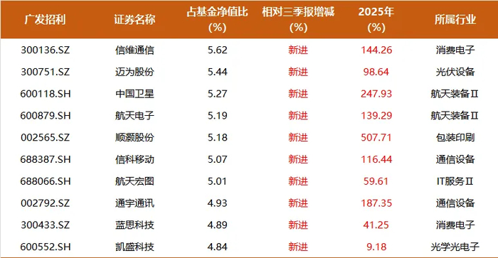 从广发招利四季报重仓股来看,基金在去年四季度全面转向商业航天领域,前十大中新进了中国卫星、航天电子、信维通信、迈为股份等一批相关公司。