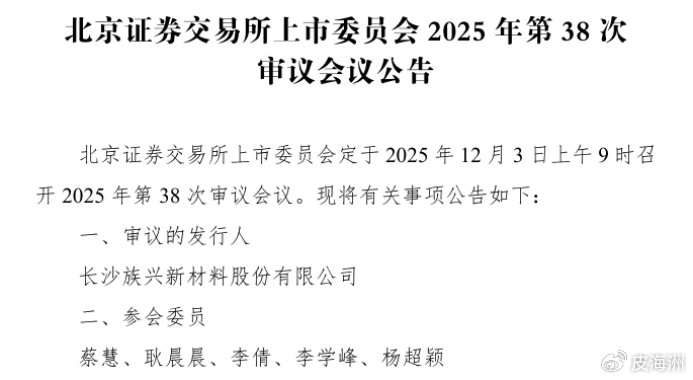 根据北交所安排,北交所上市委员会将于2025年12月3日上午9时召开2025年第38次审议会议,审议长沙族兴新材料股份有限公司(以下简称“族兴新材“)首发事宜。这也意味着族兴新材IPO进程面临着一次重要的裁决。实际上,族兴新材的上会也确实令人关注,毕竟该公司的IPO,面临着踩线上市或不符合上市条件的风险。