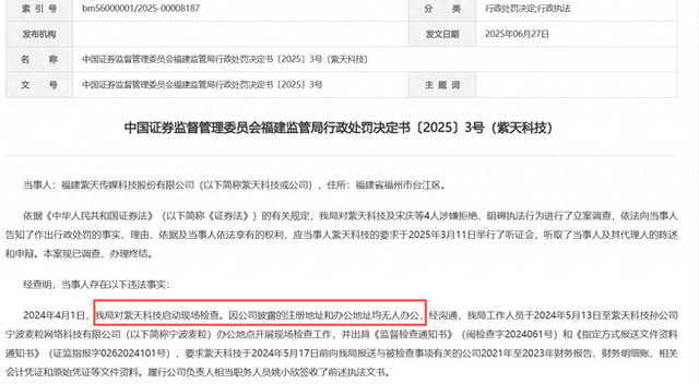 2024年4月,福建证监局决定对紫天科技进行现场检查。 工作人员带着执法证件,来到了公司公开披露的注册地——福州市某写字楼。 结果呢?大门紧闭,空无一人。 这不是周末休息,这是根本就没有人办公。
