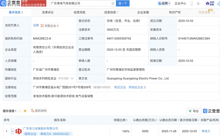 企查查APP显示,近日,广东粤电气电有限公司成立,法定代表人为汤勇,注册资本3000万人民币,经营范围为发电技术服务、新兴能源技术研发、电气设备销售。企查查股权穿透显示,该公司由粤电力A(000539)全资持股。