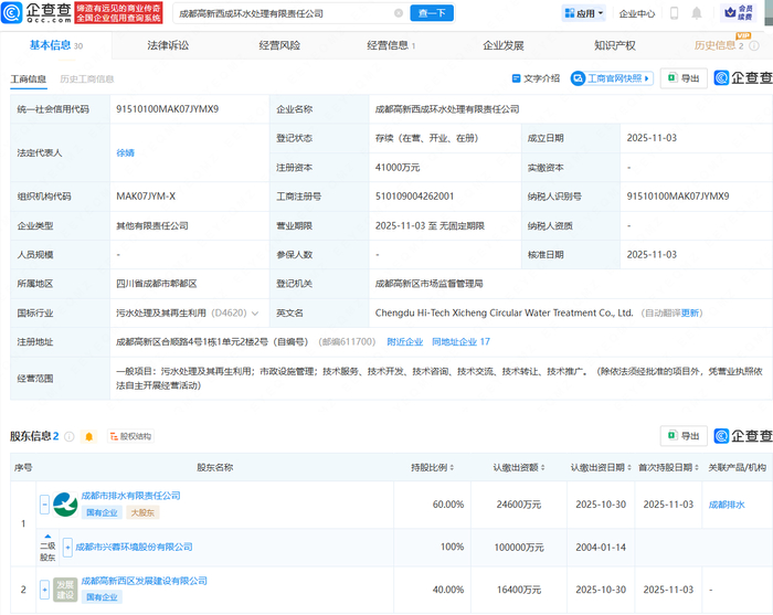 企查查APP显示,近日,成都高新西成环水处理有限责任公司成立,法定代表人为徐婧,注册资本为4.1亿元,经营范围包含:污水处理及其再生利用;市政设施管理等。企查查股权穿透显示,该公司由兴蓉环境(000598)全资子公司成都市排水有限责任公司、成都高新西区发展建设有限公司共同持股。