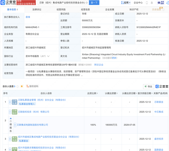 企查查APP显示,近日,芯联(绍兴)集成电路产业股权投资基金合伙企业(有限合伙)成立,出资额5亿元,经营范围包含:以私募基金从事股权投资、投资管理、资产管理等活动。企查查股权穿透显示,该企业由芯联集成(688469)全资子公司芯联股权投资(杭州)有限公司等共同出资。