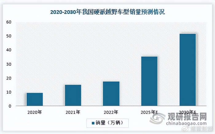 反过来看,国内文旅市场的繁荣,带动自驾游出现比例持续上升,有数据显示,今年五一期间,长途自驾出行旅游的人次占比达到50%以上。由此,观研数据推断,到2030年,广义越野车规模市场将达到131.8万辆,其中硬派越野市场规模将达51.7万辆。