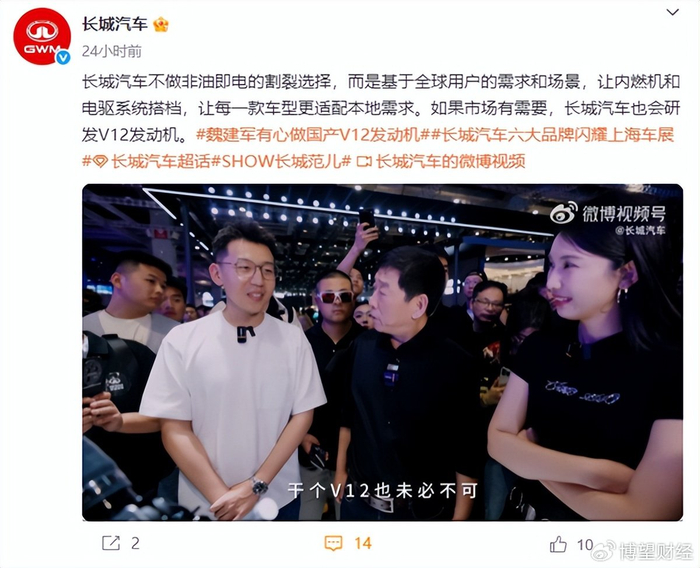 此前的上海车展上,长城汽车董事长魏建军还直接说,“我造了一辈子车,怎么也要弄个V8干一干,假如说,场景需要的话,干个V12也未尝不可!