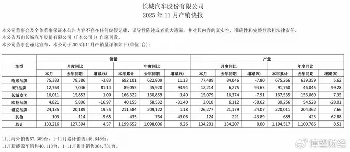 哪怕是长城汽车曾经的王牌车型哈弗H6,以前也从国内紧凑型SUV销量前几名一度被质疑在走下坡路,今年12月,据长城汽车公告,2025 年 11 月销量 13.32 万台,同比增 4.57%;产量 13.42 万台,同比持平。但哈弗销量1-11月累计销量虽然有所增长,不过11月销量 75383 台,同比降了 3.83%。
