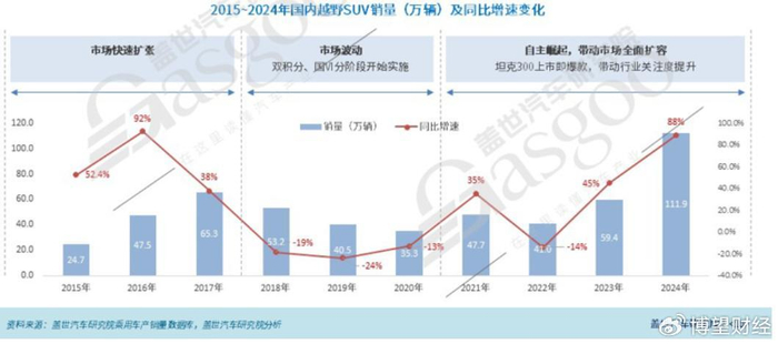 即便从整个行业看,越野市场也足够大。来自盖世研究院的数据显示,自2021年长城坦克系列掀起越野热后,越野SUV的销量再次进入高速增长阶段,仅在去年,同比增速就达到了80%以上。