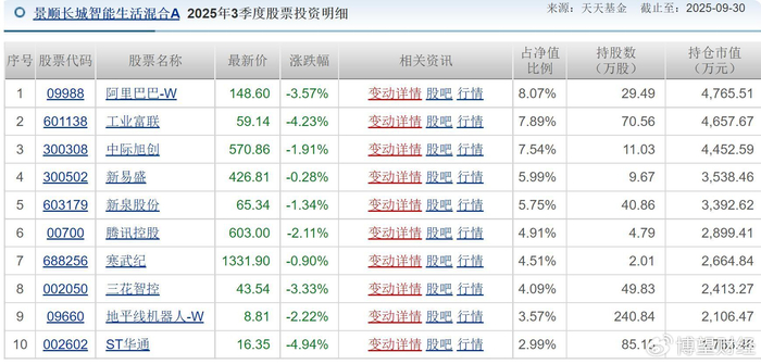 笔者发现,该基金明确界定了智能生活主题,涵盖智能家居、智能交通、智慧医疗等多个领域,通过定性与定量相结合的方法,自下而上地精选价值被低估且具有良好基本面的相关企业。如2025年三季报显示,其前十大重仓股包括阿里巴巴-W、工业富联、中际旭创等,这些公司均在智能生活的不同环节具有显著优势。