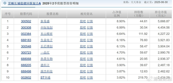 截至2025年中期,景顺长城稳健回报A的前十大重仓股均集中于AI产业链的核心环节,其中光模块领域的新易盛、中际旭创位居前两位,PCB领域的东山精密、生益电子以及存储相关的长芯博创也位列其中,前十大重仓股合计占比超过50%,呈现出显著的“算力聚焦”特征。这些重仓股所在的领域都是AI产业发展的关键环节,随着AI产业的快速发展,这些公司的业绩也有望持续增长,为基金带来丰厚的收益。