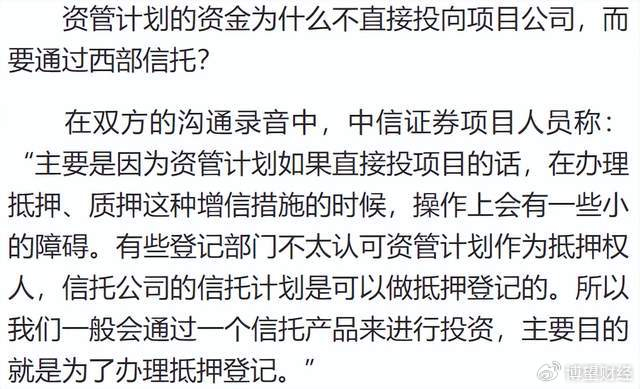 据《证券时报》报道,中信证券项目人员曾向富安娜解释:“主要是因为资管计划如果直接投项目的话,在办理抵押、质押这种增信措施的时候,操作上会有一些小的障碍。有些登记部门不太认可资管计划作为抵押权人。”