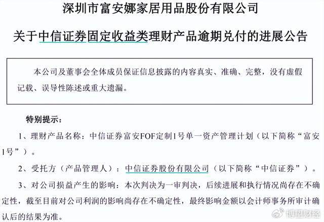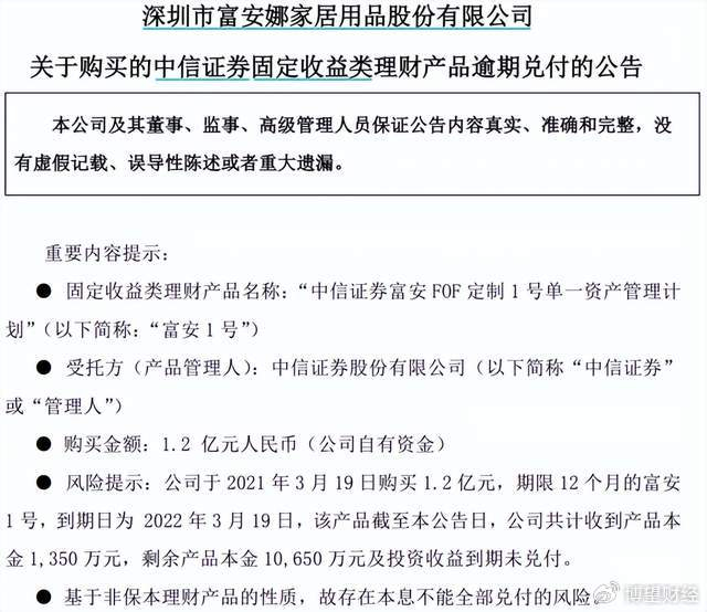 根据富安娜2022年8月发布的公告,仅于2022年4月14日收到中信证券兑付的1350万元本金,剩余1.065亿元本金及收益逾期未兑付。