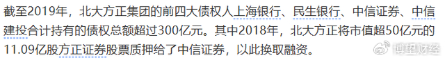据《独角金融》等多家媒体报道,截至2019年,北大方正集团的前四大债权人上海银行、民生银行、中信证券、中信建投合计持有的债权总额超过300亿元。其中,2018年北大方正确将市值超50亿元的11.09亿股方正证券股票质押给了中信证券,以此换取融资。