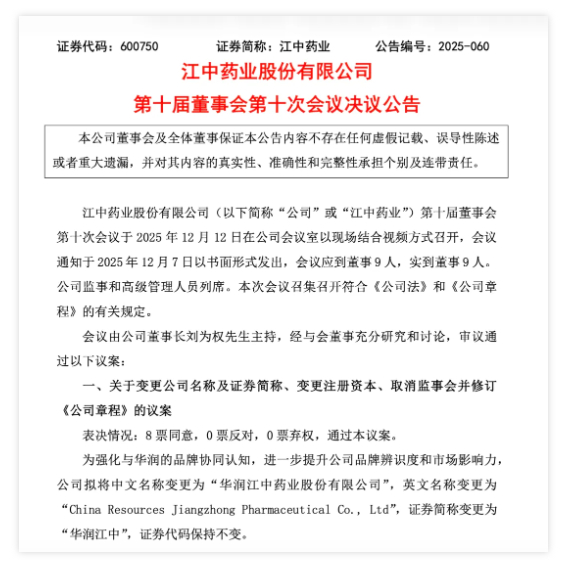 12月13日,江中药业股份有限公司发布公告称,第十届董事会第十次会议通过了变更公司名称及证券简称的议案,公司中文名称变更为“华润江中药业股份有限公司”。