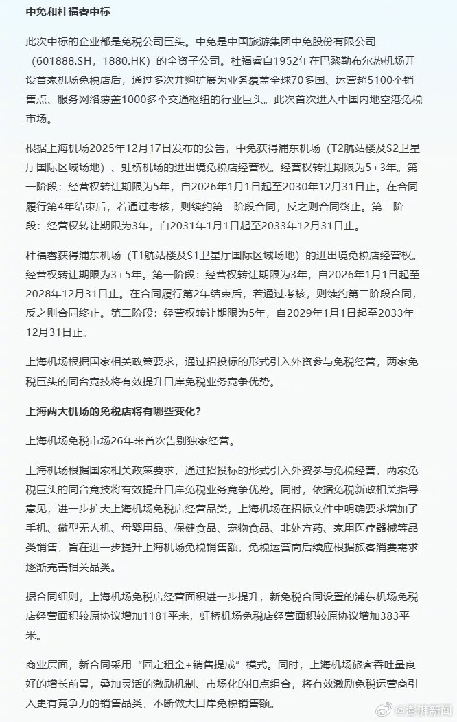 根据合同,杜福睿(上海)商业有限公司(以下简称“杜福睿”)获得上海浦东国际机场(T1航站楼及S1卫星厅国际区域场地)的进出境免税店经营权;中国免税品(集团)有限责任公司(以下简称“中免”)获得上海浦东国际机场(T2航站楼及S2卫星厅国际区域场地)、上海虹桥国际机场的进出境免税店经营权。(澎湃新闻)