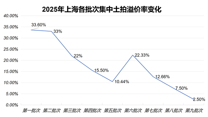 不过,此次土拍较此前明显“降温”——底价成交地块数量高达7宗,企业竞争热度大幅回落,整体溢价率仅 2.50%。根据克而瑞数据,这一整体溢价率创下了2025年上海历次土拍以来的新低,较此前第八批次的7.5%下降了5个百分点。