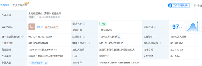 资料显示,佳运置业(全称为上海佳运置业集团有限公司)为上海老牌房企,总部位于浦东周浦。该公司由沈仁兴于1999年成立,开发项目有浦东川沙板块的“佳运公寓”、浦东周康板块的“仁和都市花园”。此前2022年,佳运置业在上海连落3子,相继开发项目“佳运名邸”、“佳运汇龙府”、“佳运瑞璟湾”。
