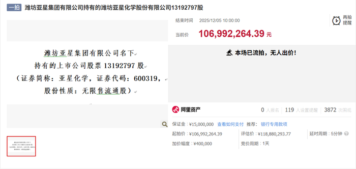 图片来源:阿里拍卖平台12月8日,阿里巴巴司法拍卖网络平台信息显示,上述亚星集团持有的1319.2797万股股票将于12月24日10时至12月25日10时进行第二次司法拍卖。截至发稿,二拍仍显示0人报名。