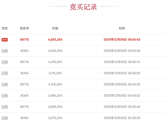 12月8日晚间,一名买家(竞买号I8354)率先“出手”,以起拍价397.53万元对226.84万股报出首价。次日上午9时30分,另一名买家(竞买号B5715)强势入场,在前者报价基础上增加1万元参与竞拍。几乎同一时间,另外两笔更大的标的(1365.82万股与2238.51万股)亦被神秘买家以起拍价锁定。