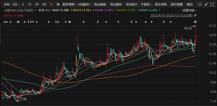 12月15日,古鳌科技股价高位震荡,截至收盘,收涨3.14%,报14.13元/股,市值48.05亿元。