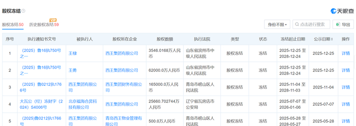 天眼查最新数据显示,截至2026年3月15日,西王集团仍有4条被执行人信息,被执行总金额达25.98亿元。此外,该公司还有50笔股权冻结信息,其中多达24笔权冻结发生在2025年。