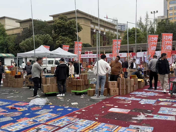 3月25日酒店展收官,酒商在锦江宾馆处理样品酒。时代周报记者摄记者向古井镇一酒企销售人员问及本届招商效果,对方摇了摇头,直言明年不再参展。