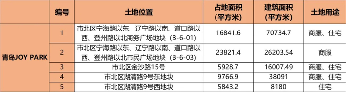 数据来源:网络公开资料,商业客整理其中,1号和2号地块相邻,位于青岛市北区啤酒文化休闲商务区,四至范围是宁海路以东、辽宁路以南、道口路以西、登州路以北合围区域,紧邻地铁2号线及4号线,两宗地块编号分别为B-6-01、B-6-03,建筑面积合计约9.69万平方米,占地面积4.06万平方米。
