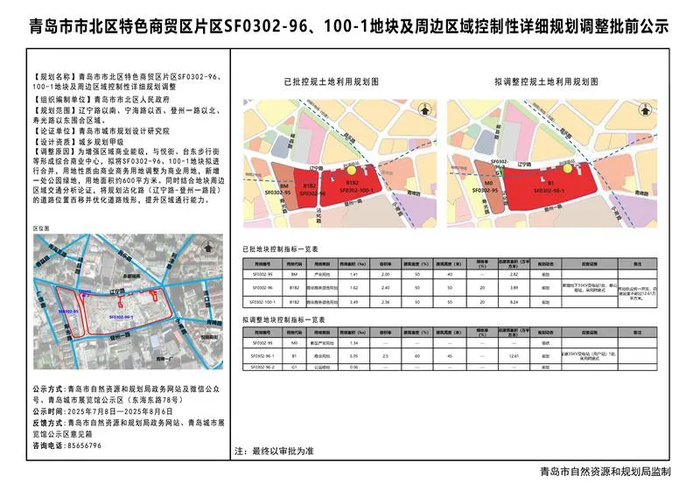 一个可以佐证的信息是,最新成交的地块原为青岛市市北区特色商贸片区SF0302-96、100-1号。今年7月,青岛市自然资源和规划局发布的规划调整批前公示显示,两宗地块拟合并为SF0302-96-1号、SF0302-96-2号。