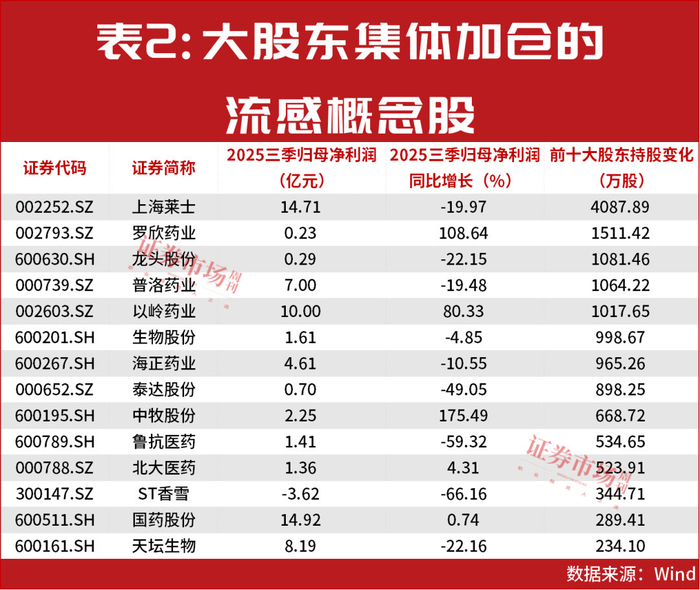 如上海莱士、罗欣药业、龙头股份、普洛药业、以岭药业5只流感概念股,其三季度末的前十大流通股股东持股数量均相比上一期增加超千万股;生物股份、海正药业、泰达股份等多只流感概念股的持股数量则均增加超百万股(见表2)。