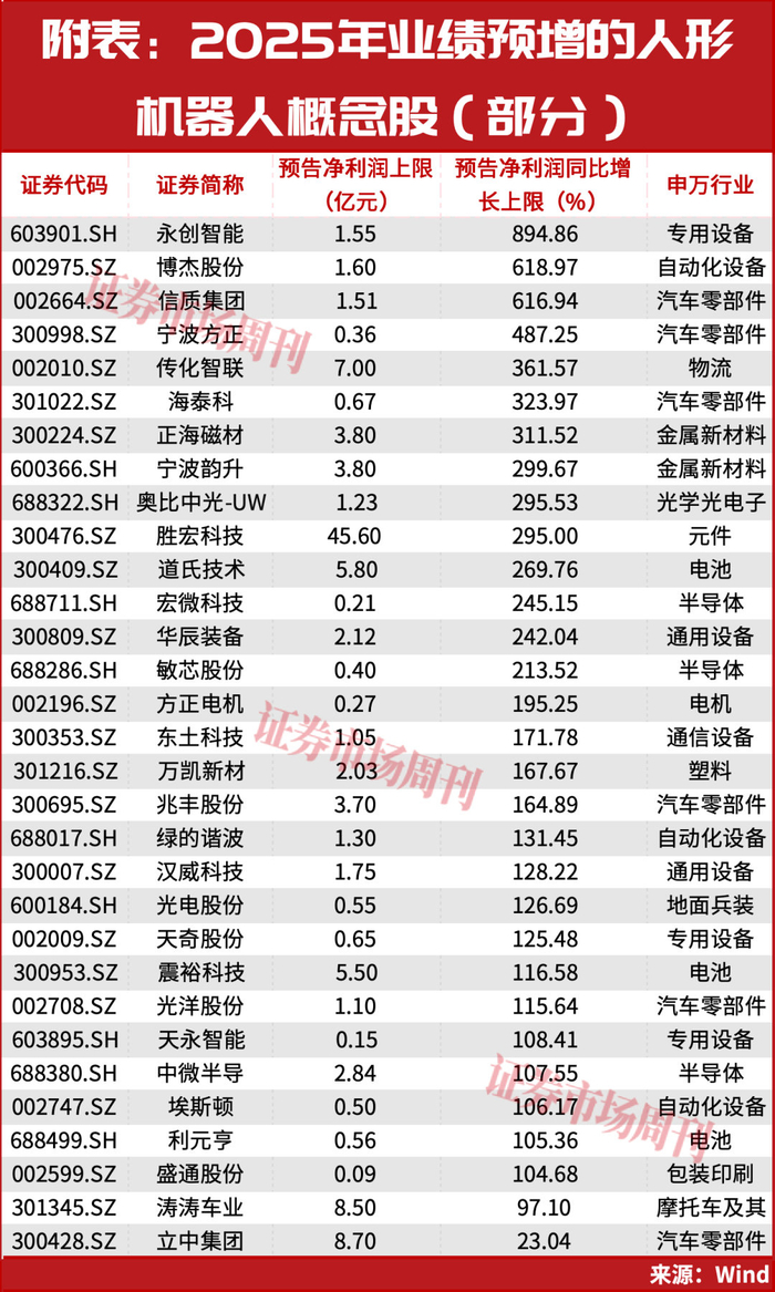 另外,人形机器人产业链公司业绩扎堆向好也为板块构成了刺激。统计已经发布2025年年度业绩预告的210余只人形机器人概念股来看,有140只预增上限为正值,占比为近七成,其中,永创智能、博杰股份、信质集团、宁波方正、传化智联、海泰科、正海磁材、宁波韵升、奥比中光-UW等一众公司预增上限均实现翻倍(见附表)。