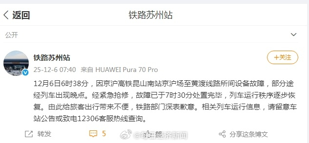 据@铁路苏州站 最新通报:12月6日6时38分,因京沪高铁昆山南站京沪场至黄渡线路所间设备故障,部分途经列车出现晚点。经紧急抢修,故障已于7时30分处置完毕,列车运行秩序逐步恢复。由此给旅客出行带来不便,铁路部门深表歉意。相关列车运行信息,请留意车站公告或致电12306客服热线查询。(上观新闻,德塔)
