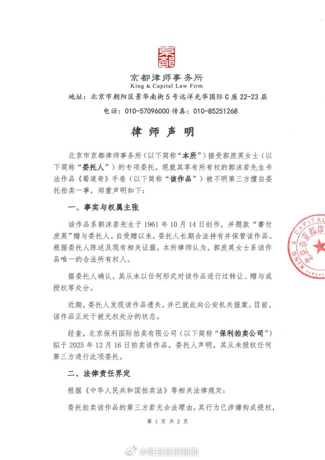 郭庶英方表示,《蜀道奇》目前已遗失,具体遗失时间不详,已向北京警方报案。《蜀道奇》上有“书付庶英”字样,郭庶英长期合法持有并保管该作品,权属清楚,从未授权任何第三方对作品进行拍卖。如果保利方面认为有权拍卖,应拿出相应证据。(封面新闻,泽塔)