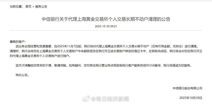 不只是国有大行,股份行亦有行动。中信银行便在10月30日称,因业务合规经营和发展需要,自11月7日起,将对代理上海黄金交易所个人交易长期不动户(仅有可用金额,无持仓)进行清理。
